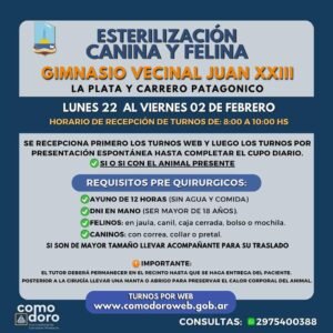 El punto de esterilización canina y felina estará en el gimnasio Vecinal del barrio Juan XXIII, ubicada en La Plata y Carrero Patagónico. Será desde el lunes 22 de enero hasta el viernes 02 de febrero.