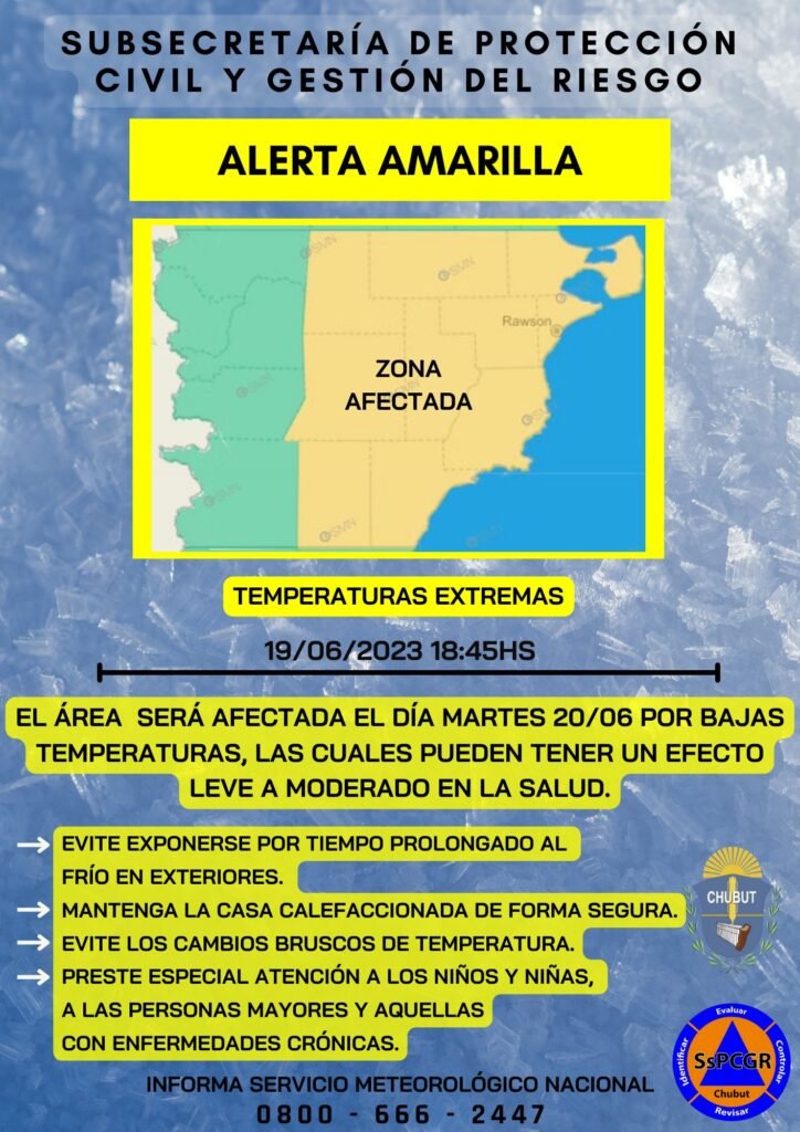 La Subsecretaría de Protección Civil y Gestión del Riesgo ha emitido una alerta por bajas temperaturas extremas que afectará a toda la zona centro y este de la provincia de Chubut. Ante este tipo de alertas, se recomienda tomar precauciones y medidas preventivas, ya que las bajas temperaturas pueden tener efectos negativos en la salud.