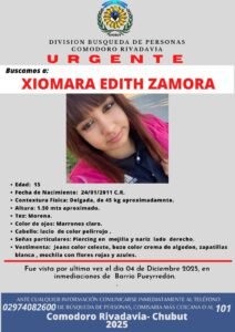 La División Búsqueda de Personas de Comodoro Rivadavia solicita la colaboración de toda la comunidad para dar con el paradero de Xiomara Edith Zamora, de 15 años, quien fue vista por última vez el 4 de diciembre de 2025 en inmediaciones del barrio Pueyrredón.