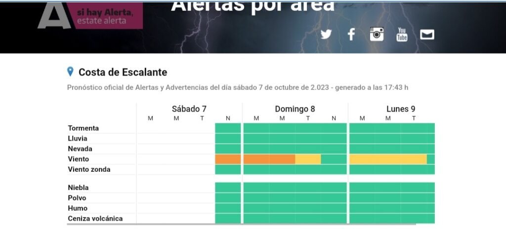 El alerta naranja permanecerá hasta el mediodía del domingo, donde los vientos del sector oeste con velocidades entre 60 y 75 km/h, con ráfagas que pueden superar los 120 km/h.