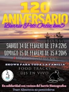 El barrio Presidente Ortiz (Km 5) se prepara para celebrar su 120° aniversario con dos jornadas de festejos abiertas a toda la comunidad. Las actividades se desarrollarán el sábado 14 y el domingo 15 de febrero en el Paseo Costero Km 5, con propuestas pensadas para toda la familia.