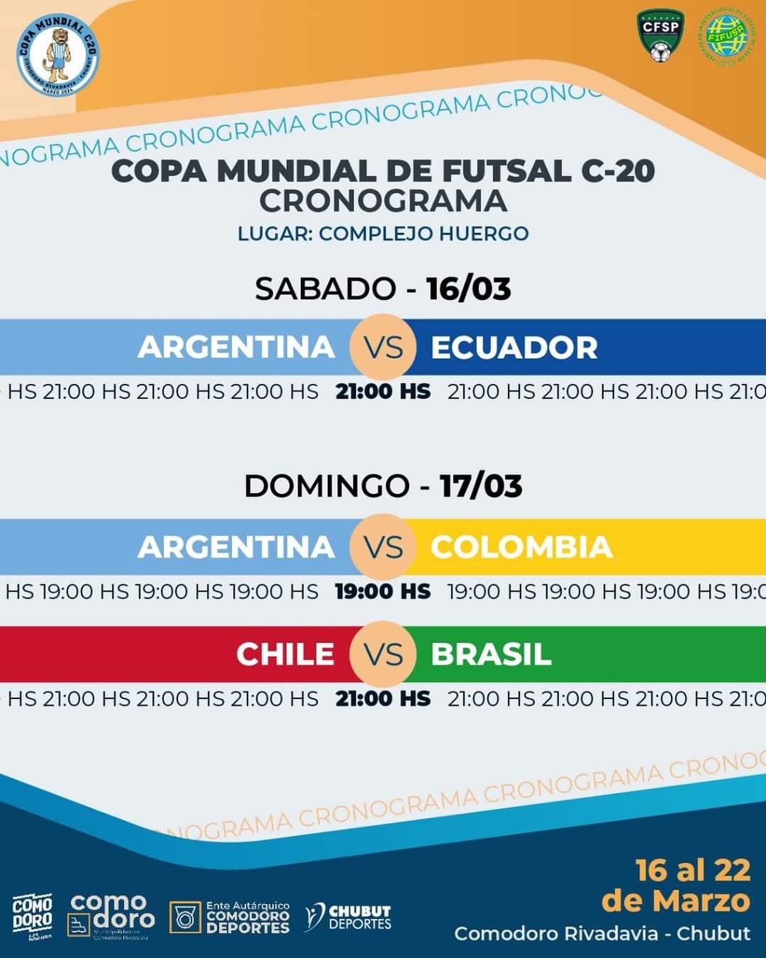 Este sábado comienza a jugarse en Comodoro Rivadavia el Mundial de Futsal C-20. El torneo comenzará con el debut de la selección Argentina ante Ecuador, el día sábado a las 21 horas, en instalaciones del Complejo Huergo.