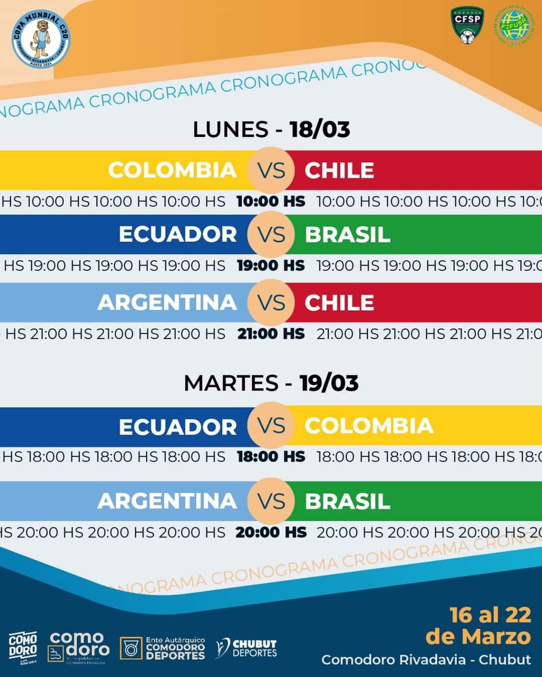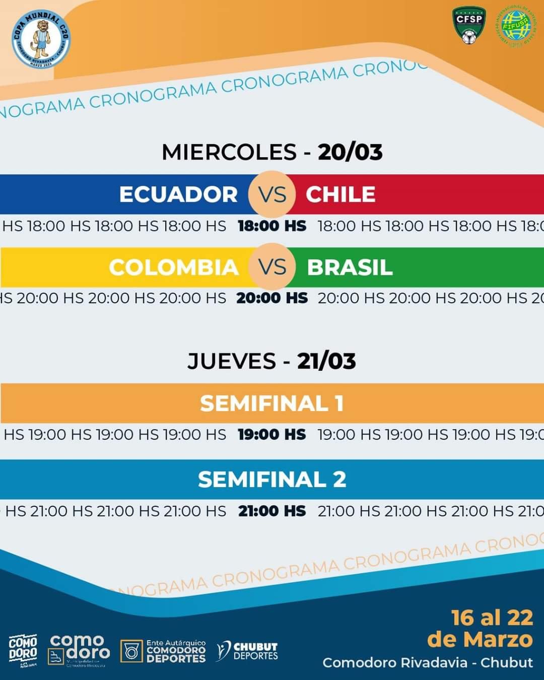 El Mundial finalizará el viernes 22 de marzo con la final programada a las 20 horas. Posteriormente se realizada la premiación.