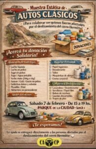 Este sábado 7 de febrero, entre las 15 y las 19 horas, el Parque de la Ciudad (Km 3) será sede de una Muestra Estática de Autos Clásicos con un marcado fin solidario: reunir donaciones para asistir a las personas afectadas por el deslizamiento del Cerro Hermitte.