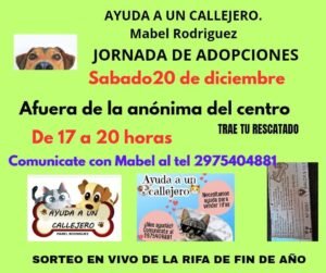 Bajo la consigna “Ayuda a un Callejero”, la rescatista Mabel Rodríguez organiza una nueva jornada solidaria que busca darles una segunda oportunidad a perros y gatos que esperan un hogar. La actividad se llevará adelante este sábado 20 de diciembre, de 17:00 a 20:00, afuera del supermercado La Anónima del Centro.