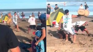 Churreros y vendedores de licuados protagonizaron una pelea a los gritos y a las trompadas en plena playa de Mar Azul. El violento episodio, que quedó registrado en video por un turista, se viralizó en minutos.