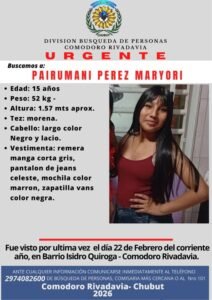 La División Búsqueda de Personas solicita la colaboración de la comunidad para dar con el paradero de Pairumani Pérez Maryori, quien fue vista por última vez el 22 de febrero. Ante cualquier información, pidieron comunicarse de inmediato al 101.