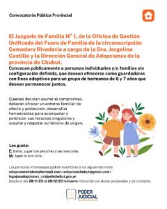 El Juzgado de Familia N° 1 de la Oficina de Gestión Unificada del Fuero de Familia de la Circunscripción Comodoro Rivadavia, a cargo de la Dra. Jorgelina Castillo, junto a la Dirección General de Adopciones de la Provincia del Chubut, lanzó una convocatoria pública destinada a personas individuales y familias –en cualquier conformación– que deseen postularse como guardadores con fines adoptivos para un grupo de hermanos de 8 y 7 años, quienes expresaron su deseo de crecer y permanecer juntos.