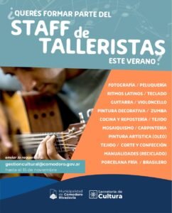 La convocatoria apunta a incorporar talleristas de diversas disciplinas, entre ellas fotografía, ritmos latinos, cocina, tejido, carpintería y otras propuestas que formarán parte de la oferta cultural y recreativa del verano.