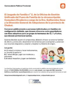 El Juzgado de Familia N° 2 de la Circunscripción Judicial Comodoro Rivadavia, perteneciente a la Oficina de Gestión Unificada del Fuero de Familia y a cargo de la Dra. Guillermina Sosa, junto a la Dirección General de Adopciones de la Provincia del Chubut, lanzó una convocatoria pública destinada a personas y familias que estén dispuestas a asumir la guarda con fines adoptivos de tres hermanas.