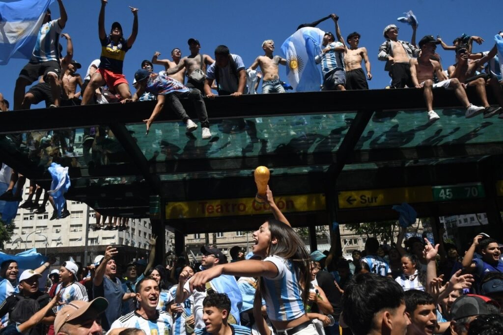 Con camisetas albicelestes y banderas, y al grito de ¡Dale Campeón! ¡Dale Campeón!, corren sobre la autopista mientras esperan que pase el ómnibus que traslada a los campeones del mundo.