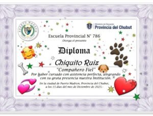 El pasado 15 de diciembre, la Escuela Provincial N° 786 de Puerto Madryn se vistió de gala para un evento de graduación inusual, pero conmovedor. En una emotiva ceremonia, se otorgó un Diploma especial a un miembro muy querido de la comunidad educativa: Chiquito Ruiz, un perro que fue condecorado como “Compañero Fiel”.