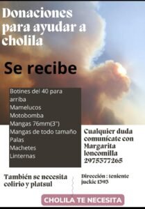 Las donaciones se reciben en la dirección Teniente Juckie 1593. Desde la organización remarcaron la importancia del acompañamiento solidario y señalaron que “Cholila te necesita”.