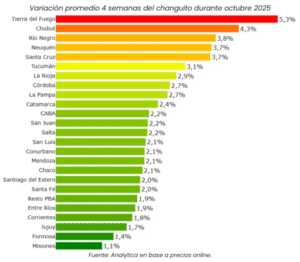 Las mayores subas se registraron en Tierra del Fuego (5,3%), Chubut (4,3%), y Río Negro, Neuquén y Santa Cruz (3,7%); mientras que las menores variaciones se dieron en Misiones (1,1%) y Formosa (1,4%).