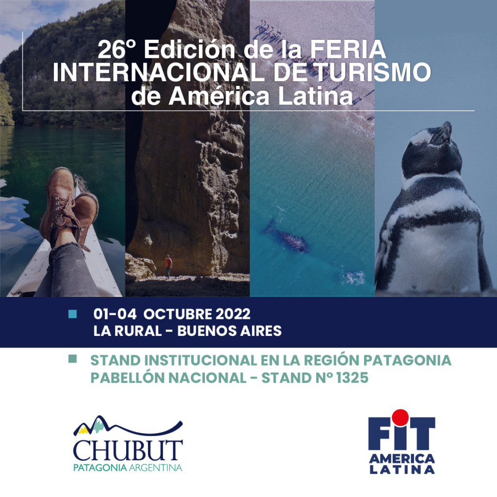 La Provincia del Chubut, a través del Ministerio de Turismo y Áreas Protegidas, estará presente del 1 al 4 de octubre en la 26° edición de la Feria Internacional de Turismo de América Latina (FIT) que se realizará en La Rural de la Ciudad Autónoma de Buenos Aires.