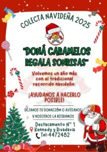La actividad consiste en un recorrido navideño por distintos barrios de la ciudad, donde los bomberos entregan golosinas y regalos a los más pequeños. Para hacer posible la iniciativa, invitan a la comunidad a donar caramelos, indicando que pueden dejar su aporte en el Destacamento o coordinar para que los bomberos lo retiren directamente.