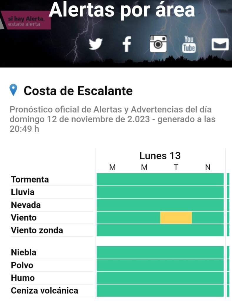 Desde el SMN, emitieron un alerta amarilla, por el viento del sector oeste, se esperan ráfagas que llegarán a los 90 km /h por la tarde. Durante la mañana y la noche la velocidad oscilará entre los 60 y 79 km/h.