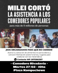 Este martes 27/02 desde las 10hs en la Plaza Kompuchewe (Plaza de la Escuela 83) el Polo Obrero invita a la comunidad y a los medios de comunicación a una jornada de visibilización y recepción de donaciones de alimentos no perecederos frente a la crítica situación de decenas de merenderos de nuestra ciudad que están en peligro de cierre frente al no envío de asistencia por parte del gobierno de Javier Milei y la ministra de “Capital Humano” Sandra Pettovello.