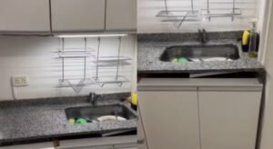 Por lo que se puede ver en el clip, el mueble no estaba al mismo nivel que la mesada y, por lo tanto, sobresalía. “Yo no lo puedo creer”, agregó. Por otra parte, las puertas de la alacena se abrían con mucha dificultad y se atascaban.