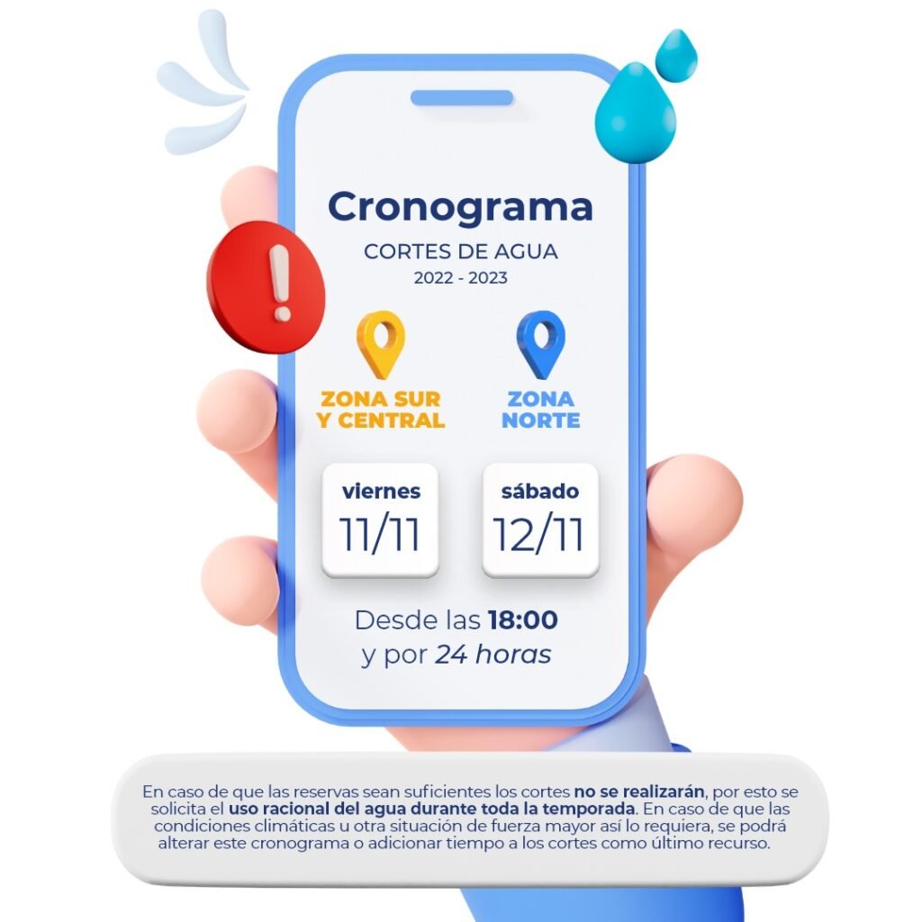 Desde la SCPL, informan a los asociados del Servicio de Agua que, dando cumplimiento al cronograma de cortes de agua programados para recuperar reservas en el Puesto La Mata, se deberá interrumpir el suministro de agua potable hoy viernes 11 de noviembre, desde las 18 horas y por 24 horas en Zona Sur y Central, y el sábado 12 de noviembre, desde las 18 horas y por 24 horas, en la Zona Norte de la ciudad.