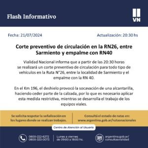 Equipos de Vialidad Nacional ya se encuentran en la zona trabajando para solucionar este inconveniente, por lo que es necesario interrumpir la circulación para todo tipo de vehículos en ese sector de la RN26.