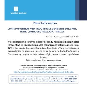 Esta tarde pasadas las 20 horas, desde Vialidad Nacional tomaron la decisión de aplicar un corte preventivo en la circulación para todo tipo de vehículo en la Ruta 3 entre Comodoro Rivadavia y Trelew. Esto se debe a la acumulación de nieve en la calzada.