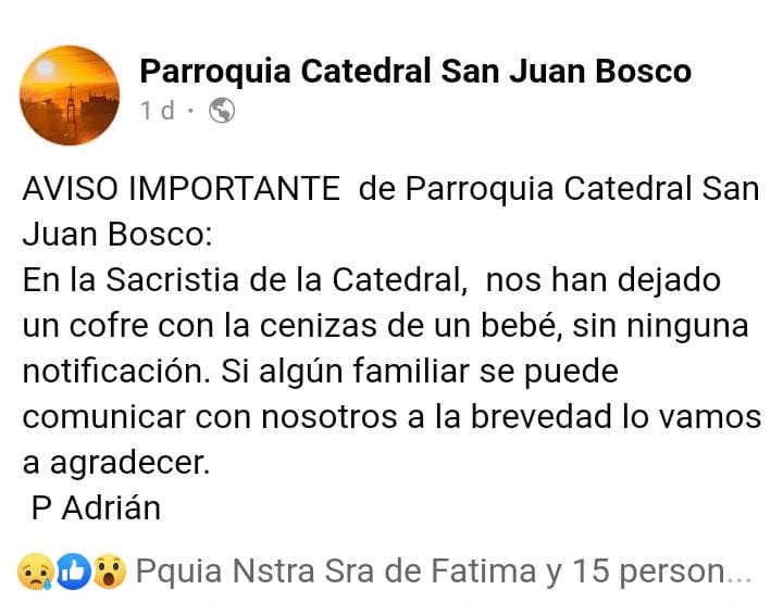 A través de las redes sociales de la Catedral de nuestra ciudad, informaron que en la Sacristía han dejado un cofre con las cenizas de un bebé, sin ninguna notificación.