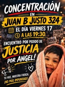 Este viernes, vecinos de Comodoro Rivadavia se concentrarán frente al Colegio de Abogados, ubicado en calle Juan B. Justo 324, para reclamar justicia por el caso de Ángel. La convocatoria está prevista a partir de las 19:30 y se invita a asistir con globos y velas en señal de acompañamiento y memoria.