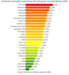 El costo del changuito tuvo mayores subas en Formosa (+2,6%), Catamarca (+2,4%) y La Pampa (+2,3%).