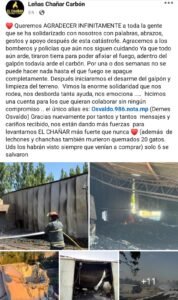 Luego del incendio que destruyó por completo su galpón y provocó la muerte de un centenar de animales en Km. 14, los propietarios de Leñas El Chañar publicaron un mensaje de agradecimiento por la solidaridad recibida en los últimos días.