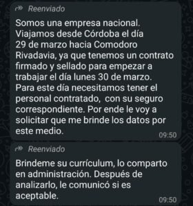 Según se informó, desde la tarde-noche del viernes comenzó a difundirse por WhatsApp un mensaje atribuido a la empresa “Óptima Limpieza Integral – Grupo Consultores de Empresas”, en el que se indica que el Hospital estaría incorporando personal y se convoca a los interesados a presentarse el lunes en el sector de Guardia.