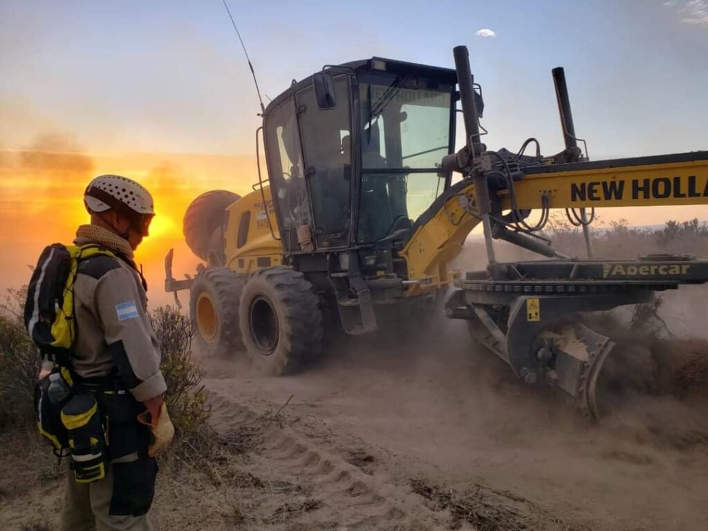 El funcionario indicó además que “lo primero que hicimos fue corta fuego en todo su perímetro y quema de ensanche, en su mayoría es algarrobal por lo que mantiene mucha brasa en el interior del perímetro. Se trabajó con dos motoniveladoras de AVP y personal de la Brigada de Defensa Civil Chubut”.