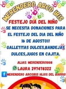 El Merendero Arcoiris está preparando una celebración especial para el Día del Niño, que se realizará el próximo 16 de agosto. Para poder llevar adelante el festejo, están necesitando donaciones de galletitas dulces, bandejas dulces y jugos en cajita.