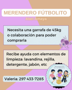 Las personas interesadas en colaborar pueden comunicarse con Valeria al 297 433-7285. El Merendero Futbolito continúa trabajando para brindar contención y apoyo a niños y familias de la zona, y toda ayuda es bienvenida para mantener su labor social activa.