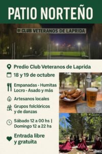 El próximo 18 y 19 de octubre, el Predio del Club Veteranos Laprida será sede de Patio Norteño, un evento con entrada libre y gratuita que comenzará a partir de las 12 horas y promete un fin de semana lleno de sabor, música y diversión.