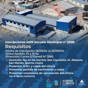 La Escuela Municipal N°2006 informa a los interesados que comenzarán las inscripciones para 1° grado del ciclo lectivo 2025.