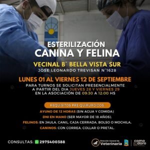 La Dirección General de Veterinaria de la Municipalidad de Comodoro Rivadavia anunció una nueva campaña de esterilización gratuita de perros y gatos, que se llevará adelante en la Vecinal del barrio Bella Vista Sur, ubicada en José Leonardo Trevisan N° 1628, del lunes 1 al viernes 12 de septiembre.