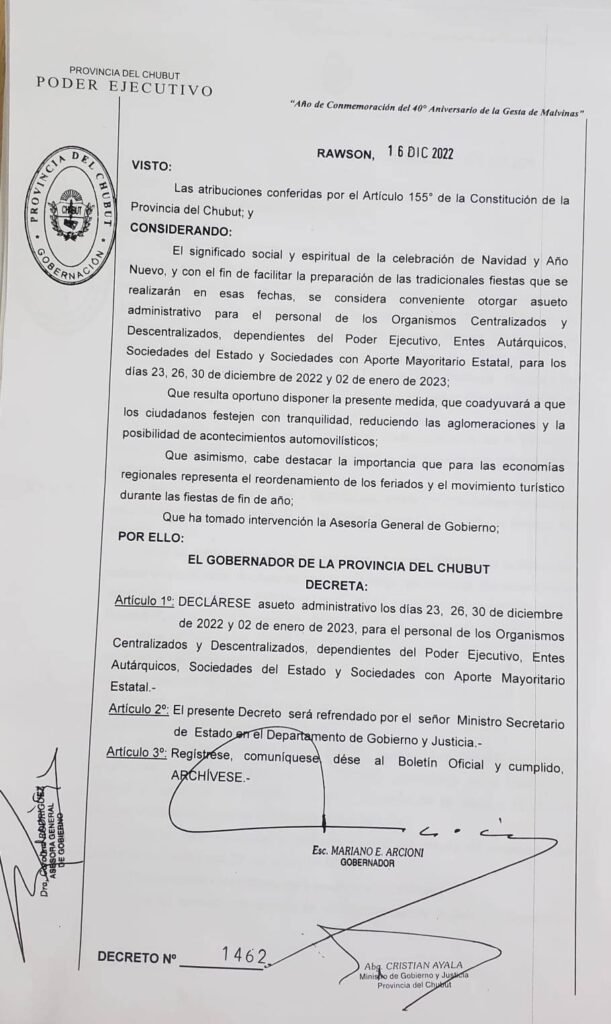 El gobernador de Chubut, Mariano Arcioni, firmó un decreto que establece el asueto administrativo para los días lunes 26 de diciembre y lunes 2 de enero, por lo cual los empleados públicos provinciales tendrán cuatro días no laborables para cada una de las celebraciones de fin de año.