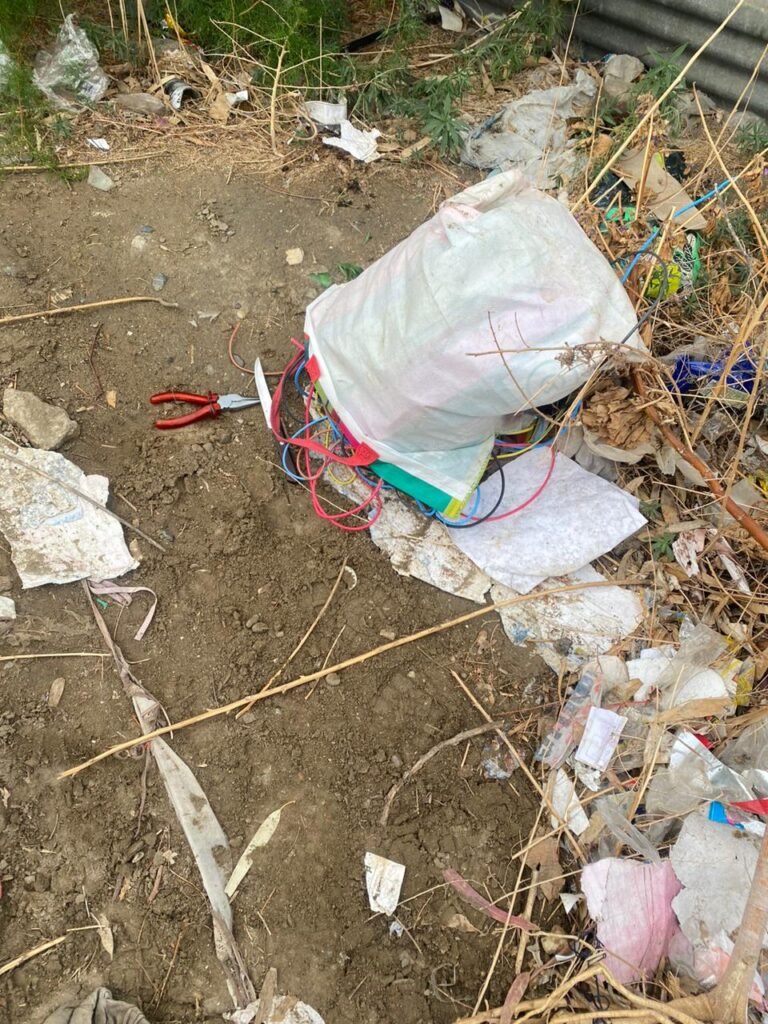 Con la información brindada por el testigo, personal policial se dirigió hasta el lugar y al observar la presencia de los agentes, estos sujetos fueron a esconderse en el interior de la garita; Asimismo en el lugar constataron que la bolsa de nylon contenía cables varios cortados, (01) pinza y (01) cuchillo tipo serrucho. Paralelamente uniformados verificaron las instalaciones de la obra en construcción, conforme las indicaciones del testigo, encontraron en uno de los ambientes, un balde sobre la mesa, dando así, alcance al techado donde están los mismos cables que se hallaron en la bolsa; aparentemente cortados previamente.