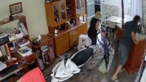 En el video se observa a una mujer que viene corriendo desde otra habitación, alertada por el ruido. “¡Ay, Dios mío, qué susto!”, se la escucha decir al ver lo ocurrido. “¿Te lastimaste?“, le preguntó al hombre, antes de ayudarlo a acomodar las cosas.
