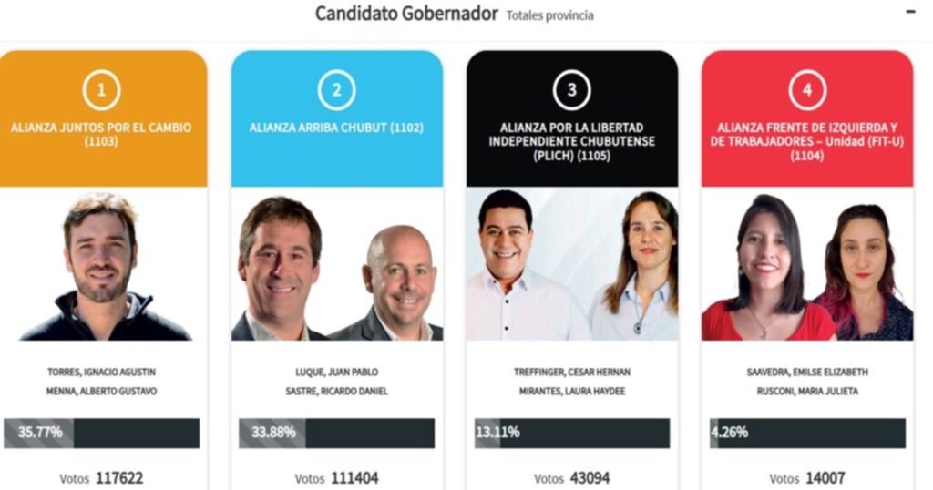 Según los datos publicados en el portal oficial del TEP, la fórmula integrada por Ignacio Torres y Gustavo Menna pasó de un 35,17% (escrutinio provisorio) a un 35,77%. Es decir, sumó 989 votos, pasando de un total inicial de 5.229 votos de diferencia frente al tándem Juan Pablo Luque-Ricardo Sastre, a unos 6.218 sufragios por encima de la segunda fuerza. En el caso de la fórmula de Arriba Chubut, la misma redujo su caudal de votos de un 34,11% a un 33,88%,Qué pasó con las otras fórmulas