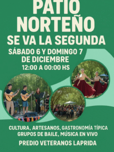 Este sábado 6 y domingo 7 de diciembre, Laprida se viste de fiesta con la 2° edición del Patio Norteño, un encuentro que celebra la riqueza cultural y artesanal de la región. Desde el mediodía y hasta la medianoche, vecinos y visitantes podrán disfrutar de una feria que combina lo mejor del arte local, la gastronomía típica, y espectáculos en vivo.