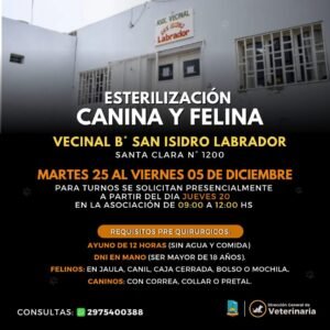 La Dirección General de Veterinaria anunció una nueva campaña de esterilización gratuita para perros y gatos, que se realizará del martes 25 de noviembre al viernes 5 de diciembre en la Vecinal del barrio San Isidro Labrador ubicada en Santa Clara al 1200.