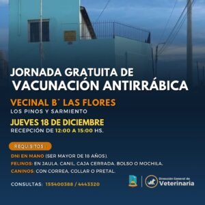 Desde la Dirección de Veterinaria informaron que este jueves 18 de diciembre, se realizará una jornada gratuita de vacunación antirrábica en el barrio Las Flores. La actividad se desarrollará en la sede vecinal ubicada en Los Pinos y Sarmiento, en el horario de 12:00 a 15:00.