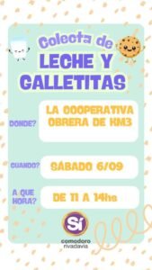 Este sábado 6 de septiembre, de 11 a 14 horas, se realizará una colecta solidaria de leche y galletitas en la Cooperativa Obrera de Km 3. La iniciativa invita a la comunidad a colaborar con alimentos que serán destinados a personas en situación de vulnerabilidad.