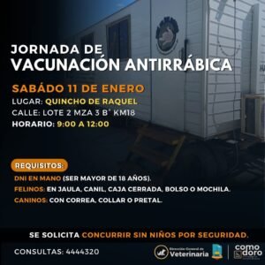 Desde la Dirección de Veterinaria de la Municipalidad de Comodoro Rivadavia informaron que este sábado 11 de enero habrá una jornada especial de vacunación antirrábica.