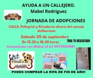 Mabel Rodríguez, bajo el lema “Ayuda a un callejero” llevará adelante este sábado 20 de septiembre una nueva jornada de adopciones en el Centro de Comodoro Rivadavia.