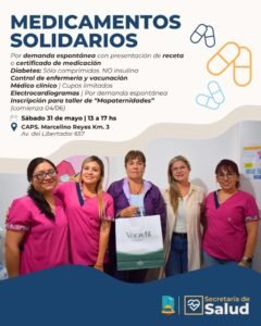 La Secretaría de Salud anunció una jornada especial de Medicamentos Solidarios que se realizará el sábado 31 de mayo, de 13 a 17 horas, en el CAPS Marcelino Reyes, Km 3 (Avenida del Libertador 657).