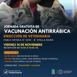 La Dirección General de Veterinaria de la Municipalidad de Comodoro Rivadavia realizará una nueva jornada gratuita de vacunación antirrábica destinada a felinos y caninos del barrio Stella Maris.