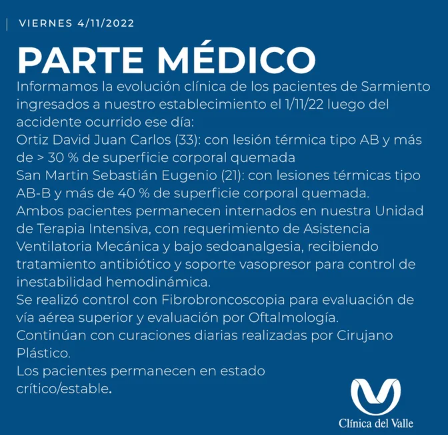 Luego de una primera asistencia por parte de personal del Hospital Zonal de Sarmiento, se determinó la derivación de tres de los soldados a nuestra ciudad hacia la Clinica del Valle y otro a La Española, con heridas de diverso carácter, se encontraban internados en grave estado, intubados, con quemaduras en vías respiratorias y en un 30 y 40 por ciento del cuerpo de tipo B o tercer grado, informaba el parte emitido, este viernes